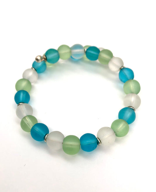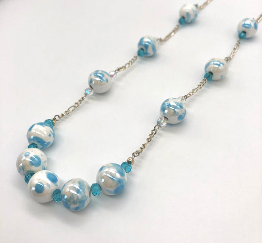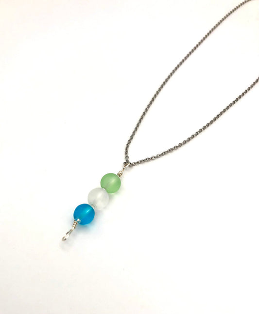 Aqua, light green, white frosted round glass bead pin pendant silver chain necklace