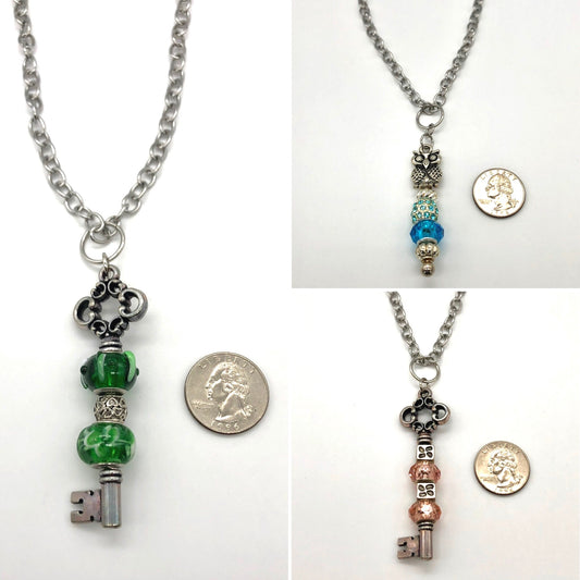 Antique silver skeleton key with glass bead pendants stainless steel chain necklace