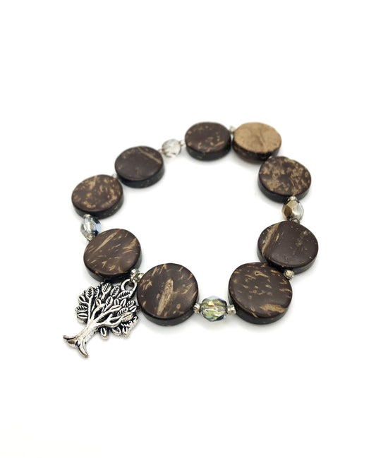 Antique silver round tree charm, round wood bead, amber glass bead stretch bracelet