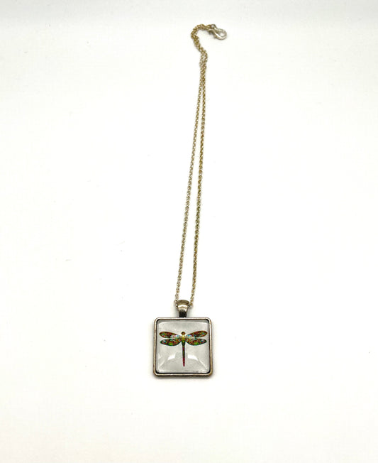 Antique silver dragonfly print square pendant chain necklace-limited edition